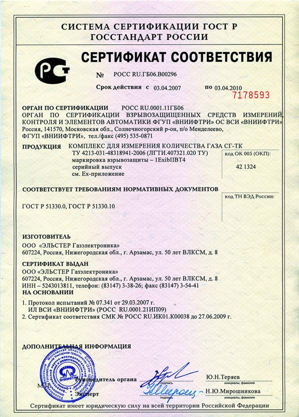 Измерительные комплексы СГ-ТК2-Д допущены к использованию в РФ и зарегистрированы в Государственном реестре средств измерений под номером 33874-07.