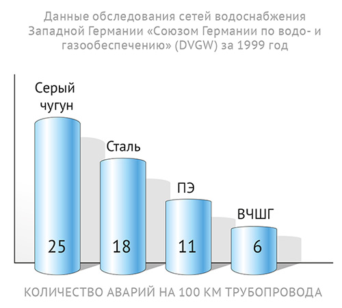 Трубопроводы из ВЧШГ обладают наименьшей аварийностью по сравнению с трубопроводами из других конструкционных материалов. Многочисленные испытания позволили сделать вывод, что трубы из ВЧШГ, наряду с расчетными допустимыми нагрузками, имеют достаточный резерв надежности, что идеально подходит для сложных условий прокладки трубопроводов.