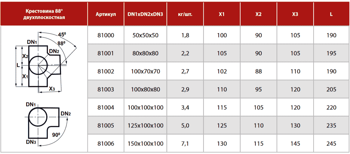 Крестовина двухплоскостная 88° — безраструбный фитинг для монтажа трубопроводов под углом 88 градусов. Крестовины производятся согласно EN877 из чугуна методом литья.